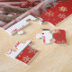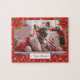 Helgdagar för ljusjulen med poinsettia-blommor i det övre kant och en julröd bakgrund med mjuk snöflingor och en God jul-plack. Elegant jul med redigerbart foto av en söt valp. Anpassa genom att ändra fotot.