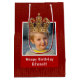 Backa dina presenter i en röd presentväska i royalets anpassningsbar som har en elegant av guld shimmery linjer. Anpassa den här lysande designen med ett foto av din unga födelsedagspojke, komplett med en vacker guld kung krona. Lägg till en speciell beröring med personligen hälsning, t.ex. "Grattis på födelsedagen, [barns namn]!". Den här presentpåsen i anpassningsbarna är en perfekt för vilken pojkes födelsedagsfest som helst och tillför ett magiskt drag till varje gåva. Se fullt samling för en version med en liten flickas prinsessa krona.