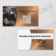 Falskt borstat koppar framhäver bakgrunden i denna visitkortsmall med en platshållare för foto till vänster och mallnamn och titel till höger. Baksidan har en matchande design och färger med textfält för företagsnamn och detaljer. Ersätt fotots platshållare med ditt eget foto i stående format och byt ut QR-koden mot din egen. Fyll i mallens fält eller klicka på Anpassa för att välja typsnitt, storlek och färg som du vill. Platshållarbilden kommer från pexels.com.