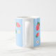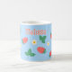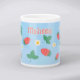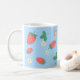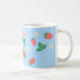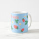 En söt och snygg kopp som har ett förtjusande och lekfullt mönster av spridda mini-jordgubbar mot en mjuk, himmelsblå bakgrund. Jordgubbarna är avbildade i en livfull röd färg med gröna blad och är utspridda med små, ömtåliga vita eller ljusgula jordgubbsblommor, vilket ökar charmfaktorn. Det övergripande intrycket är glatt, fräscht och sött, vilket gör det idealiskt för barn.