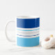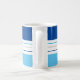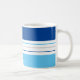 Det moderna kaffet mugg har ett färglöst mönster med blått och vitt rand. Anpassa det med ditt namn vid grund.