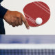 Enkelt rött och vitt pingpongpaddel med spelarens namn. Med hjälp av mallen är det enkelt att anpassa paddeln.
