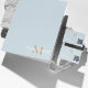 Modern anteckningsblock, elegant och trendig har här i dammblått med beigefongram och vit namn-typografi. Du kan anpassa färg efter eget val