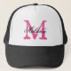 Personlig namn monogram nyare truckerkeps för rosa av brud och murmeldjur. Vintage brev med monogrammet namn med snyggtens skripttypografi. Cute bröllopsfest gynnar gäster, vänner och familj. Gör ditt eget för att bruden ska vara och bruden, brud, maid of honor, blomma, hedersatron, budens mamma, mor i brudgummen, ring osv. Roligtens tillbehör till elegant giftermål, klassens möhippa, roligtens bachelorette, förlovning, årsdag, flickorna helg resa, flickorna nattute, dam natt osv.