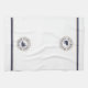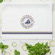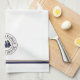 Personlig nautisk logotyp kökshandduk för segelbåtar. Vit med marin blå och brunt cirkelemblem med klassisk blocktext. Dubblan fodrade gräns i marinblått och brunt.