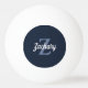 Den här personligen pingpong boll har ett blå grått monogram och ett vitt refleskript namn på en marin blå bakgrund.