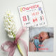 Ett kort med information om anpassningsbarnas födelse med all din lilla baby födelseinformation och ett foto på andra sidan. Ett kort för nyfödda perfekter som du kan de stora nyheterna.
