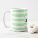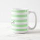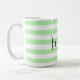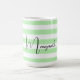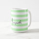 Mugg har en strimlad mönster i pastellform och vit grönt med anpassade namn i svart handskrift.