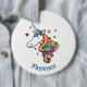 En magisk knappbricka för anpassningsbar som visar en enhörning med en blomande regnbåge med färgstarka stjärnor spridda runt. Perfekt för all enmajsmajs älskare.