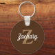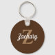 Den här nyckelkedjan för personlig har ett brunt monogram och ett vitt reflektorskript namn på brun bakgrund.