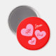 Den här söta designen börjar med en levande valentinröd bakgrund och har 3 rosa hjärtan i ett kluster, som håller din älskade namn... i modernt typsnitt. Ditt namn ligger precis ovanför. Lägg till namn genom att följa uppmaningen "Anpassa den här mallen". Gör en underbar gåva till mamma! Den här knappdesignen ser också ut att slå på den samordnande plattan!