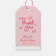 Imponera på dina gäster med söta anpassade tack-märken för dina bröllopsfest-favoriter. Designen har "Tack" i en fantasifull handskriven stil med hjärt-doodles i en rosa och röd färgpalett. Alla färger är redigerbara! © Kimbellished, LLC