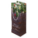 God jul vin-presentpåse med en skorstensbakgrund, festive julgran grenar, red & guld träd dekoration, gräs cones och string twinkle ljus.