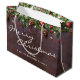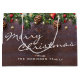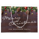Anpassningsbar god jul-presentpåse med mörk baksida av trä, festive julgran grenar, red & guld träd dekoration, gräs och snörptråd ljus.