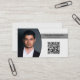 Den här visitkortsmallen har en platshållare för foto med mallnamn och yrke och din QR-kod. Baksidan innehåller textfält för företagsnamn och information. Ersätt fotots platshållare med ditt foto och QR-kodens platshållare med din egen. Fyll i mallens fält eller klicka på Anpassa för att välja typsnitt, storlek och färg som du gillar. Låter QR-koden länka till potentiella kunder till din webbplats, kundrecensioner, projektfoton eller en annan specifik länk. Fotots platshållare tillhandahålls av pexels.com.