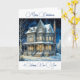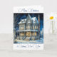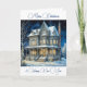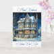 Vinterhuset i säsong belystes på ett julkort för personlig på snönatten.