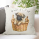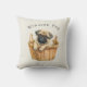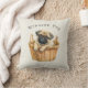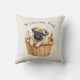lägg till din pugs namn på detta vackra kastkudde med en fawn pug som sitter i en korg av flätad korg på en krämfärgad bakgrund.