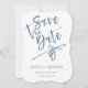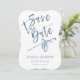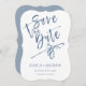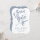 Romantiskt blått färgband Spara datumkortet med Bröllop Ringar - Personlig Spara datumkortet för Bröllop med blått Ringar och kallgrafi Meddelande om speciella dag med eleganten Spara datumkortet, med en klassisk blå och vit design. Den här inbjudan visar vackert formaterad kalligrafi och en charmerande illustration av sammanlåsningen av bröllop ringar. Perfekt för bröllop, detta kort exuderar romantik och är sofistikerat. Idealisk för par tittar för en mjuk, raffinerad beröring för deras bröllopsinbjudningar. Anpassa informationen för att skapa ett minnesvärt första intryck för dina gäster.