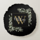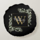 Elegant akvarell grönska blad blomster monogram namn rund kudde med en guldmonogram initial på en svart bakgrund med ditt namn i ett stilrent vitt skript. Designad av Thisisnotme©