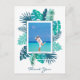 Vackra blågröna botaniska strandväxter pryder detta vackra tack-kort efter bröllopet. Skapa dina egna speciella tack-kort genom att lägga till ditt eget foto från ditt tropiska öbröllop. En lycklig leende parmall väntar på din personliga bild med palmlöven.