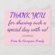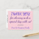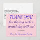 Denna enkla, tydliga och tacksamma vykortsdesign från personlig bröllop innehåller budskapet "TACK för att dela en så speciell dag med oss!" på framsidan, tillsammans med ett anpassade-meddelande på baksidan. Den har färg som rosa och lila. Det skulle kunna användas för att uttrycka tacksamhet till någon som var gäst vid en ceremoni i bröllop.