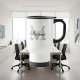 Personlig namn typografikaffe i monogram för att gå resemugg. Vintage monogrammad kista med snyggt script brev. Cute anpassningsbar födelsedag eller bröllopsgåva till för manar och kvinnor (hans och hennes). Snyggt kopp med elegant svart och vitt färg. Tillgängligt som stort överdimensionerat jumbo mugg i extra och att resa. Dubblans sidokonstruktion.