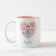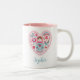 En söt matryoshka rysk kapdoll dekorerar mugg. Matryoshka är i hjärtform med fåglar, fjärilar och blommor. Anpassa det med ditt namn. Gör en söt gåva. Designad av Blackberry Boulevard.