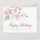 Vattenfärgsfärg för elegant, tomt vykort med grattis på födelsedagen. Pastel rosa, dammiga blommor från ro (rosor) med lätt sage grey. Anpassa genom att lägga till din handskrivna anteckning.