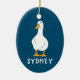 Alla förtjänar sitt eget prydnadsföremål på Julgran till och med på ankor. Oavsett om du är tittar för perfekten för ditt eget anka eller vill skapa en unik personlig för anka älskare på din helgdag shoppinglista, är den här personlig dekorationen ett perfekt val. Den innehåller en illustration av ett vitt anka med orange och fot inställda mot en marin blå bakgrund med en namn nedanför i roligtens vita bokstäver. Baksidan av prydnadsämnet har en mönster vita fjädrar från anka mot en marin blå bakgrund.