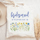 Den här enkla eleganten till väskan har ett gräns av vilda blommor i gultens nyans och blått med gröntar. Ord "bridesmaid" visas i blåhandskript. Anpassa det med namn i sans serif-teckensnitt. Gör en perfekt till en gåva.