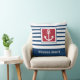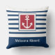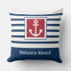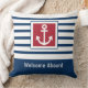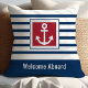 Lägg till en touch av nautisk charm i ditt kustnära hem eller båthus med denna personliga kudde som har enkla marinblå ränder, en illustration av ett ankare och en klassisk marinblå och röd färgpalett. En glad "Välkommen ombord"-hälsning sträcker sig till dina gäster. Anpassa denna design genom att lägga till ett familjenamn eller annan text för att skapa en unik present i marin stil för husägare vid kusten eller båtentusiaster.