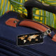 Ett modernt bagagemärke med personlig som innehåller en världskarta över vattenfärgen i guld som sätts på svart bakgrund. Utformningen finns på båda sidor av bagagetaggen och du kan enkelt anpassa den med ditt namn och din kontaktinformation.