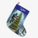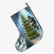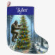 Personlig Bigfoot julstrumpor. Bigfoot som dekorerar Julgranar i skogen med prydnadsföremål och julgranar ljus. Måne lyfter genom träd. Lägg till lite saquatch humor till julen med tecknad bok stil art.