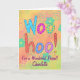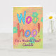 Berätta för någon hur speciell deras vänskap är med detta kort. Ord WooHoo är på färglös orange och limegrön grumlig bakgrund. Anpassadet ord For a Wonderful Friend och personlig namn ligger under ord textkonsten. Känslan ord inuti kortet är också anpassade att uttrycka vänskap. Konsdesignbakgrunden är texturerad och ombre färg med blommor och konstblommor. Färg: Turkos teal blue orange lime green lila.