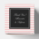 Personligens förmånslådor för bröllop | rosa och design av vita stift rand mönster. Gästerna har rätt att få gåva. Anpassningsbarnas bakgrund färg med vitt linjer. Tack för anpassningsbarnas budskap med namn av brud och triom på toppen. Liten storlek låda för godis och små trinklets. Skriv ut eleganten för klassi bröllop.