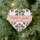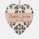 Personifiera denna nätt rosa och bryna den antika damastast anpassningsbar för lätt bekymrad vintage och prydnaden för personligbröllopfavör med det brud- och brudgum namn och datera av deras bröllop. Tillfoga ett personligt meddelande till baksidaen av prydnaden. Denna hjärtformade prydnad gör underbara favörer för en personligt bröllp och att gifta sig minnessaker eller gåvor för dina brudtärnor. Design© Chrissy H. Studio, LLC. All reserverad rättigheter.