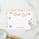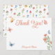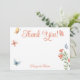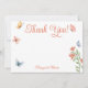 Anpassningsbart tackkort i orange typografi med en vacker och delikat illustration av akvarell vildblommor och fjärilar på framsidan med gott om tomt utrymme för att skriva ett handskrivet tackmeddelande. Baksidan av tackkortet har ett vackert mönster med vildblommor och fjärilar.