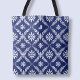 Personlig väskas elegant blåa mönster med initial Stor shoppingväska har en snygg design med mörkblå bakgrund och invecklade vita abstrakta blommotiv och geometriska element. Väskan är elegant personlig med en initial, vilket ger en sofistikerad och unik touch. Perfekt för daglig användning, erbjuder denna tote både stil och praktiskhet, vilket gör den till en mångsidig accessoar för allt från avslappnade utflykter till shoppingturer. Dess moderna design och funktionella utrymme gör den till en idealisk present för modeinriktade individer, som ger en chic och personlig touch.