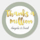 En anpassningsbar runt tack för att du klisterat med ett modernt skript i faux guld-folie färg. Infoga namn i ställe på den exempeltext som visas i designmallen. Det här klistermärket är ett bra val för bröllopsfavörer eller annat tillfälle att tacka. (Observera att det här är en digitalt tryckt bild av hög kvalitet och inte guld.)