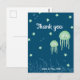 Bedårande tacksamhetskort med neutrala färger och ett undervattens tema. Perfekt som tack för en baby shower eller för ditt företags marknadsföring. Illustrationen av den lilla maneten i grönt med bakgrundskorall, fiskar och stjärnor är bedårande. Detta vykort koordinerar bra med inbjudan som du kan hitta i min butik. Anpassa texten med din egen information. Illustrerad och designad av Patricia Alvarez.