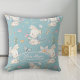 En bedårande vit kanin håller en rosa blomma i mönstret på denna kudde för barnkammaren. Nära botten finns en oval med barnets namn och födelsedatum. Allt är placerat på en medelblå bakgrund. Baksidan av kudden har samma mönster utan oval eller text. En söt present till en babyfest!