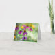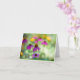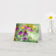 Närbild violer och gula blommor, mjuk fokus. Insidan av kortet lämnas tom för personligt meddelande.