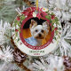Kom ihåg ditt älskade husdjurs första jul med detta 2-foto, 2-sidiga julprydnadsföremål som innehåller din egen hund, katt eller annat husfoto, omgiven av en blommigt röd och grönt poinsettia och grå blommigt andedräkt. Enkel att anpassa med ditt foto, namn och år.