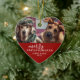 Hjärtformade Personlig Tryckt Photo jul Ornament med ett anpassad design med ett foto av hundar eller valpar med "Merry JesusMUTTS" och deras namn och år på en festlig röd typografi.