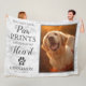 Pet-hund filt för fleecy med ett uppskattat foto av ditt älskade hund, en modern vit marmorbakgrund, ett packtryck med ett hjärta, ett sympaticitat som lyder "du lämnat ditt tass avtryck för alltid på mitt hjärta", plus deras namn och data.