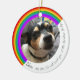 Ett regnbågsfoto ram med plats för skriva av ett speciellt meddelande samt ytterligare information och ett foto på ornamentets baksida. På temat Rainbow Bridge och förlust av husdjur. Utformning av Night Uggla Menagerie, 2023.