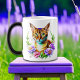 Söt stil ai-konst med söt tabby katt omgiven av rosa och lila blommor. Offerten på baksidan säger: "Petals n Purr".