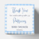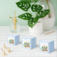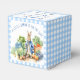 Peter-kanin med en babydusch för blå jacka och trädgårdsodling gynnar en -preferenskall för personligen. En söt bunny i blå jacka som står i veggie-trädgården för en pojke-babydusch, en blåskinka-låda som är lämplig för godismandel i nöt, kan passa omkring 20 jackat mandlar