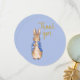 Peter på en blå bakgrund med texten "Tack" i guld.