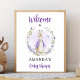 Välkomsthälsning för Watercolor Peter Rabbit Lila Baby Shower Poster. Matchande objekt är tillgängliga.